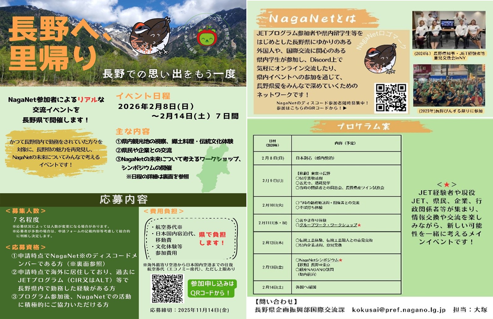長野県は、2026年2月8日から14日まで、海外にいる県ゆかりのJETプログラム経験者らを招き、県とのつながりを深める滞在型交流イベント「NagaNet Connect(仮称)」を開催する。同県は、2024年にクレアニューヨーク事務所でJET経験者と知事との意見交換会を行うなど、北米をはじめ、世界中のJET経験者との連携に力を入れている。今回のイベントは、県がディスコード上で運用する国際交流ネットワーク「NagaNet」の活用促進を図るとともに、県内自治体や企業など地域とNagaNet参加者との交流促進につなげることを目的としている。
