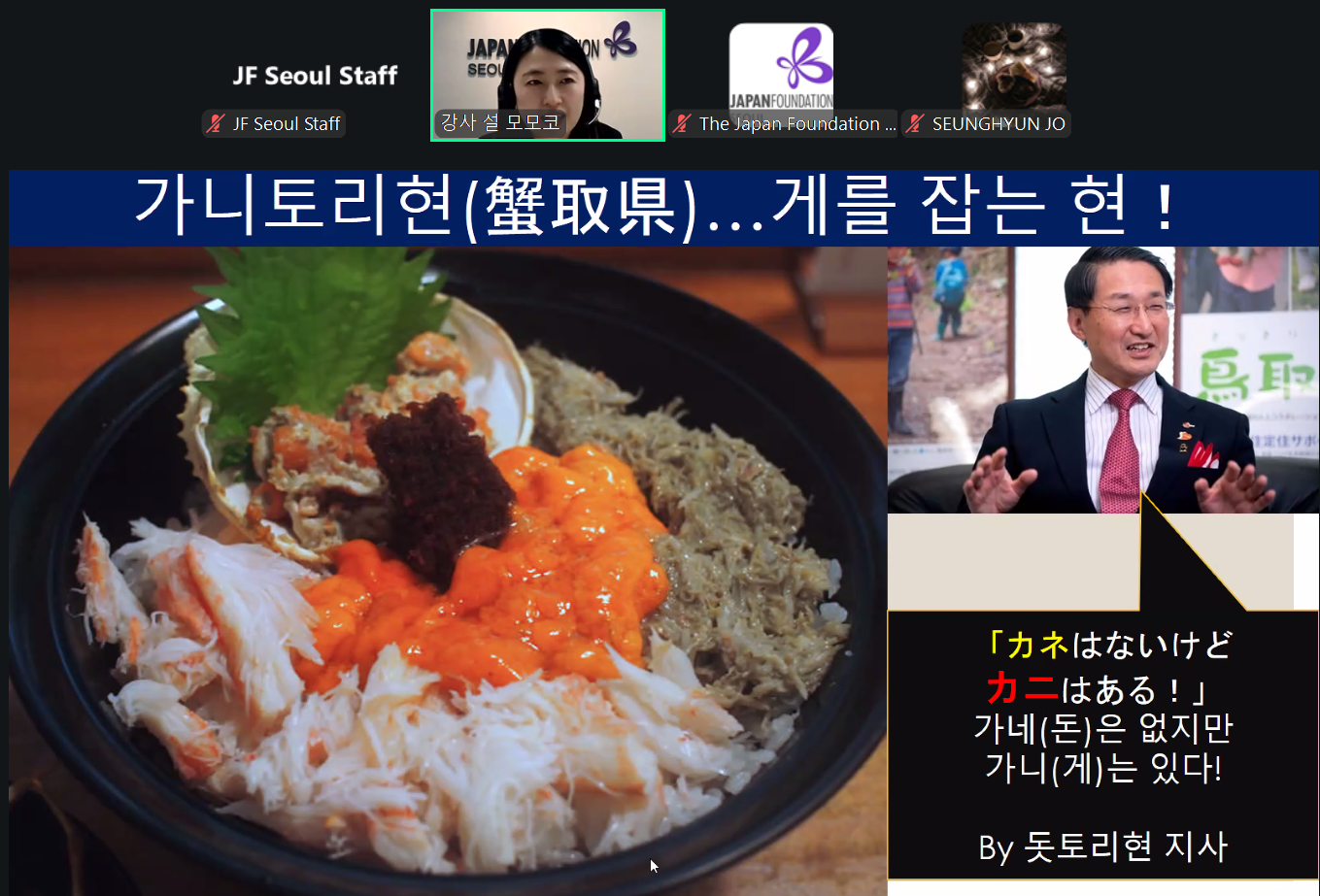◇オンライン文化講座で地方都市の魅力発信=ソウル クレアソウル事務所は、日本の地方自治体の魅力や地域文化を紹介するため、大学や関連機関等で各種講演活動を行っている。こうした取り組みの一環として、国際交流基金ソウル日本文化センターが3月に開催したオンライン文化講座(全3回)で、日本の地方都市の魅力を紹介した。 この講座は、同センターが会員らを対象に定期的に実施しているオンライン講座で、これまで主に日 本の芸術や文化等をテーマに開催されてきた。今回は「日本の地方都市」をテーマに企画されたため、クレアソウル事務所が協力することになった。 講座では、同事務所の長崎県駐在員や徳島県駐在員、鳥取県派遣者が講師となり、各地域の歴史や文化、観光、国際交流の取り組みなどについて紹介した。各回、約70人が参加し、参加者からは、日本の観光地へのアクセス方法や、食、祭り等の地域文化に関する多くの質問が寄せられた。(ソウル事務所)