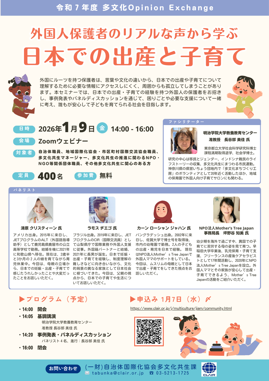 対象者:自治体職員、地域国際化協会・市区町村国際交流協会職員、多文化共生マネージャー、多文化共生の推進に関わるNPO・NGO等関係団体職員