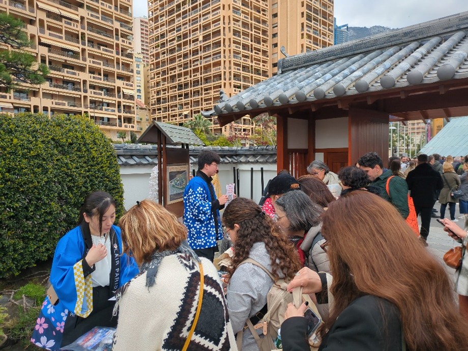 日本とモナコの外交関係樹立20周年を記念して、モナコ日本庭園で3月21日にイベント「Journee du Japon」が開催され、クレアパリ事務所はブースを出展して日本各地の魅力を発信した。式典には、日本から三笠宮家の彬子さま、モナコからはアルベール二世公、シャルレーヌ公妃両殿下らが出席。会場では、和太鼓の演奏が披露されたほか、伝統工芸の展示や体験型ワークショップなどが行われ、来場者は日本の伝統文化や芸術などをそれぞれ楽しんでいた。 クレアパリ事務所は、会場の入り口付近にブースを設置。式典前後の時間帯に来場者が集中するなど、終日、多くの人でにぎわった。自治体のパンフレットやノベルティグッズを求める人が多く、用意していたものが早々になくなったほか、日本酒の試飲も訪れた人の関心を集め、大変好評だった。 来場者はモナコ国内に加え、フランスのニースなど周辺の都市からも訪れており、訪日時の思い出を楽しそうに語ったり、日本への長期旅行の計画について会話を弾ませたりする場面も見られた。(パリ事務所